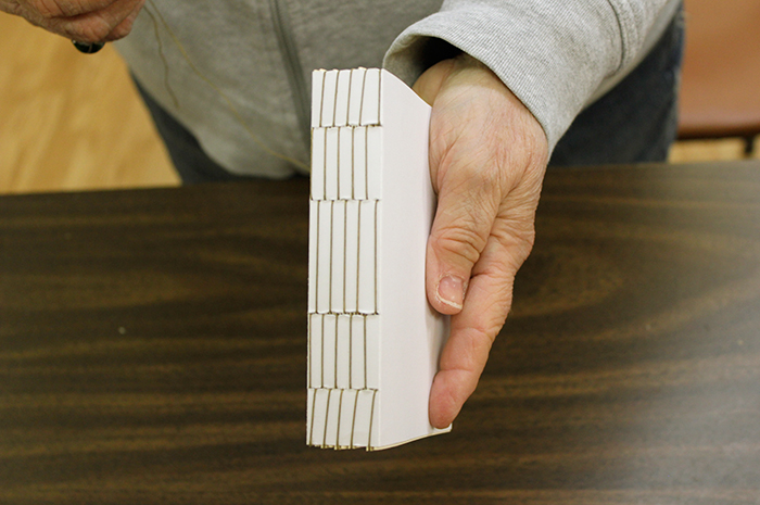 In this simplest form of Longstitch binding, folded sections of pages are sewn together by linking the sections through a slotted cover sheet to create a pleasing staggered exposed sewing along the spine. Stitching wrapped around the head and foot of the paper spine gives the beaded look of a thread headband at the edge of the spine. We will finish off our books with a decorative folded paper slipcover.