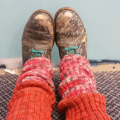In my haste to finish up with painting for the week, I splashed turquoise paint across my already battered and stained 23-year-old painting boots. A little memento.