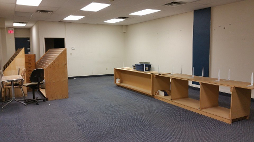 It was pretty dingy, with horrible carpeting, walls full of drywall plugs, and lots of heavy particle board displays to dismantle and throw away (many, many more of those low counters fill the basement).