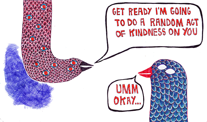 A guy in my Spanish class said he was going to spend his 30th birthday doing “random acts of kindness” to people only his idea of how to do this was basically knocking on people’s doors and announcing to them that he was going to do them a kindness. I’m sure that’s not going to scare anyone.