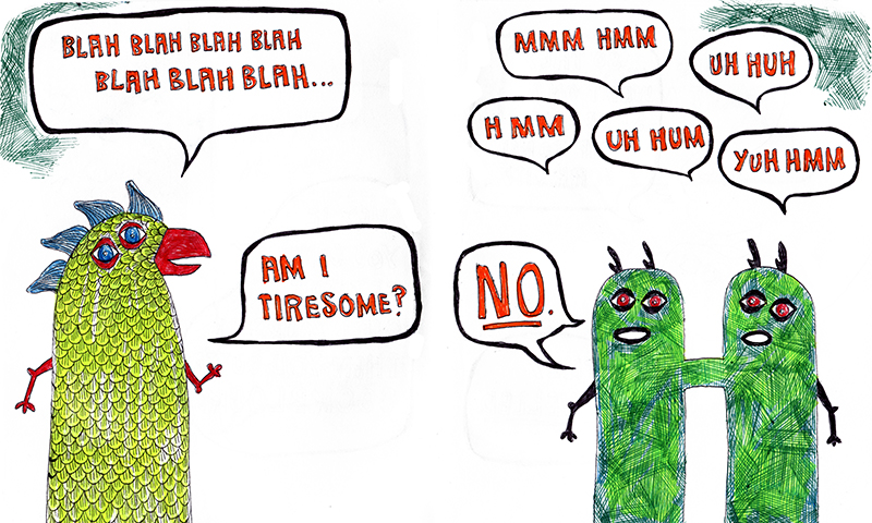 tiresome December 22, 2014 A conversation in our living room, only in an odd role reversal, the character on the left is Peter and the one on the right is me.
