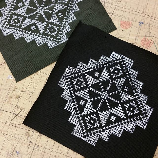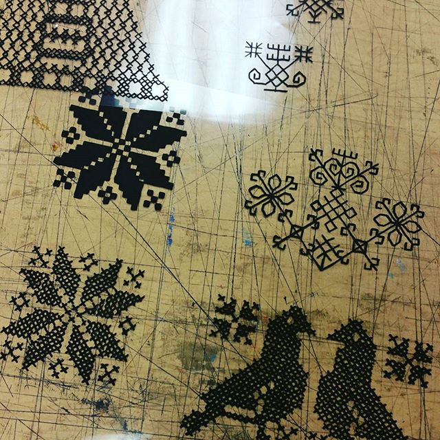 Screenprinting some hand drawn embroidery patterns onto squares of twill and suiting fabric, for iron-on patches: